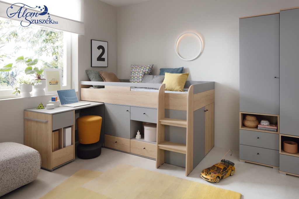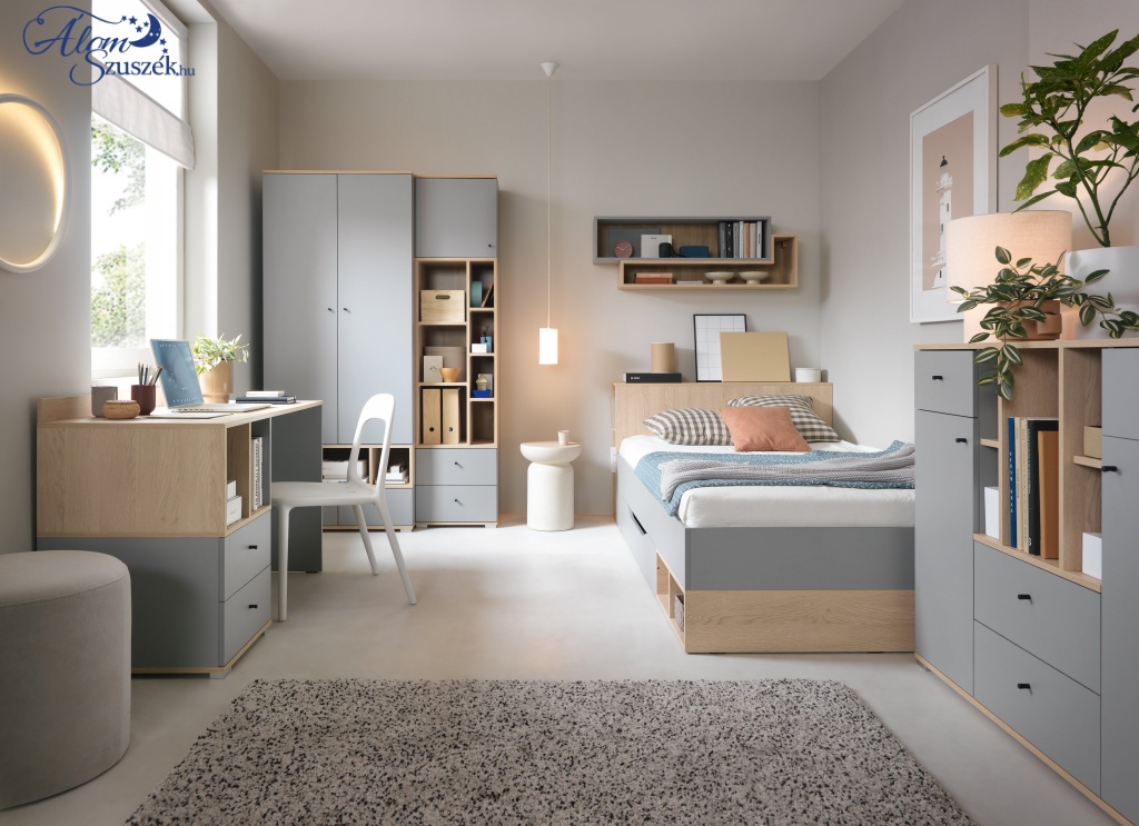 A tölgy otthonossá teszi a szobát, míg a szürke modernné. A két szín kombinációja tökéletesen illik egy tinédzser szobájába.