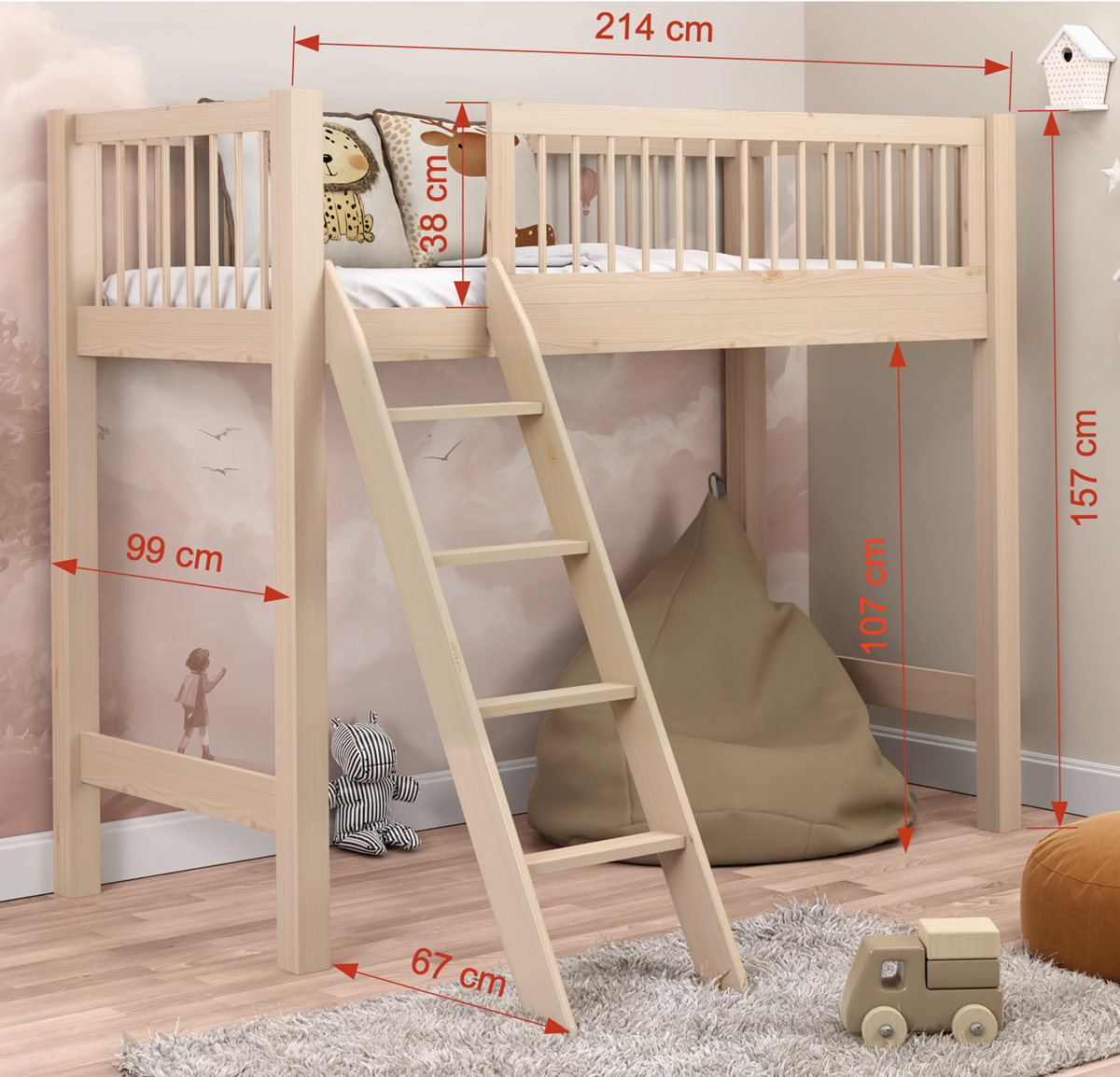 Az ágykeret alsó szintje 107 cm magasságú.